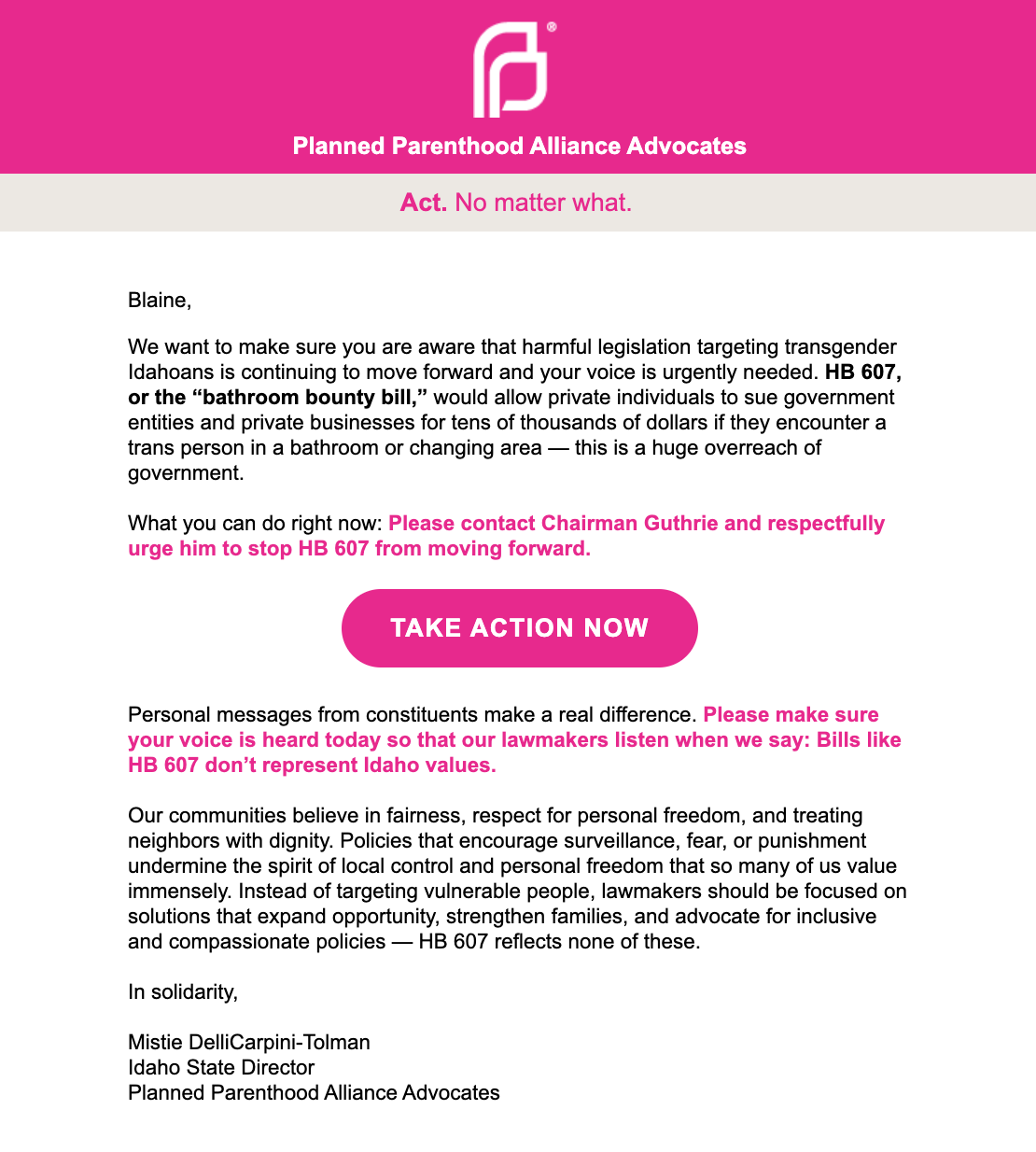 Chairman Guthrie and other committee members need to know that Planned Parenthood doesn’t speak for real Idahoans like you—so send your message now!